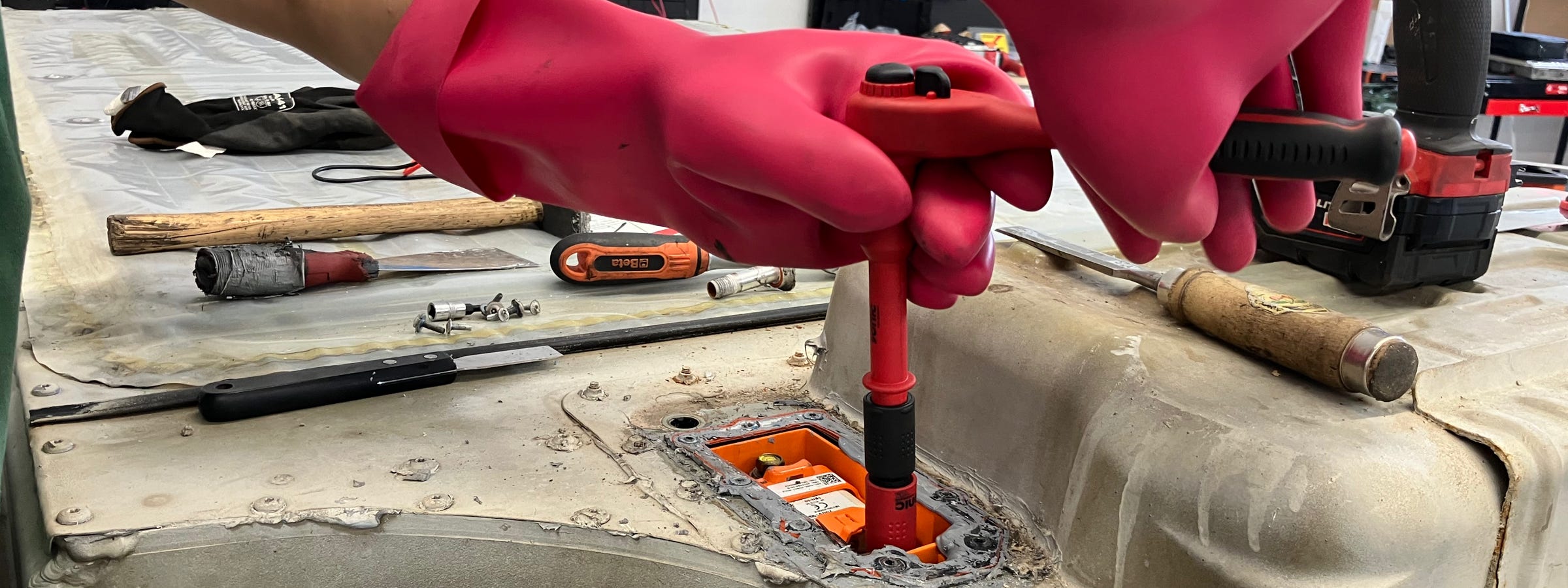 Wir öffnen den Akku und entfernen sämtliche Dichtmassen, die im Laufe der Jahre aushärten. Eine Prophylaxe, um sicher zu gehen, dass auch in Zukunft keine Feuchtigkeit den Akku zerstört.